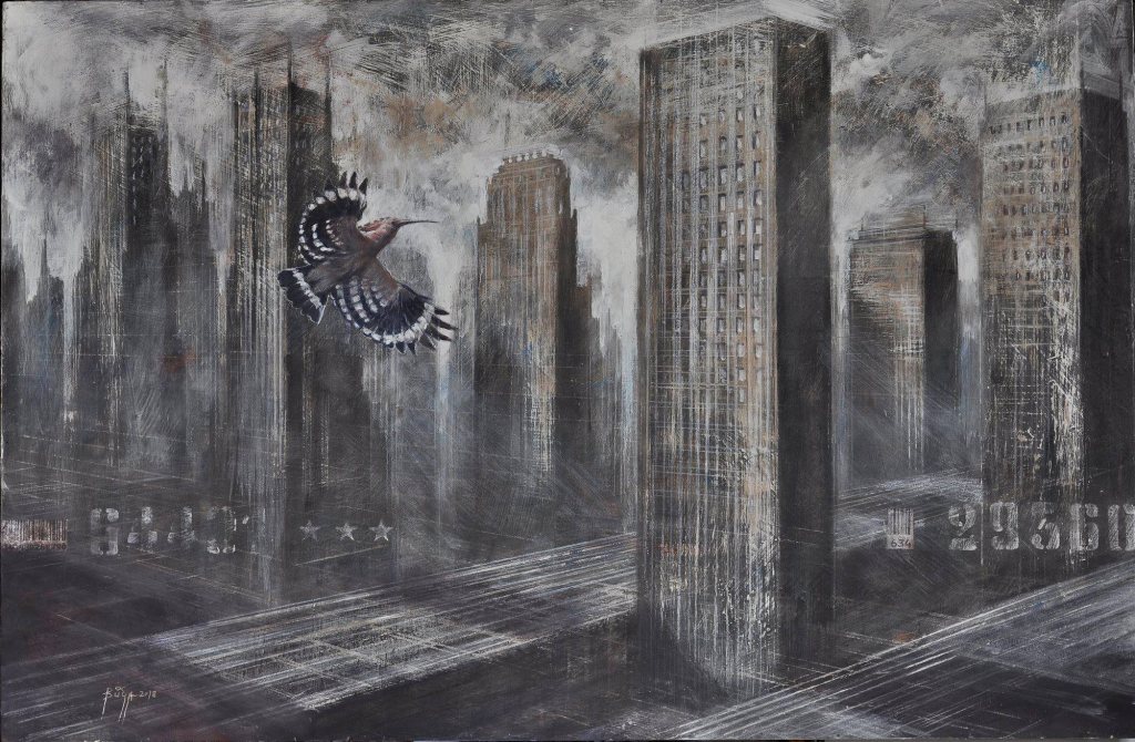 I suoi dipinti contengono anche un marchio, che marchio non è, perché è un vero e proprio codice a barre, lo stesso che troviamo sui prodotti, e che segnano la produzione del nostro tempo, caratterizzata da un forte consumismo. Ebbene, proprio questo marchio è diventato un’icona, un segno, un’immagine forte che ruota quasi sempre nei dipinti del nostro artista, dando di lui un’idea forte della sua arte che non e’ avulsa dalla storia degli ultimi anni, di quella storia economico-sociale che ha dato ai paesi occidentali e capitalismi processi accelerati.